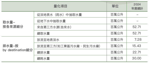 本公司依據營運需求進行取水與排水管理,持續落實節水措施,並確保符合法規要求。主要取水來源為自來水,2024年度總取水量 52.71 百萬公升。